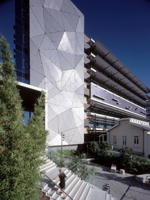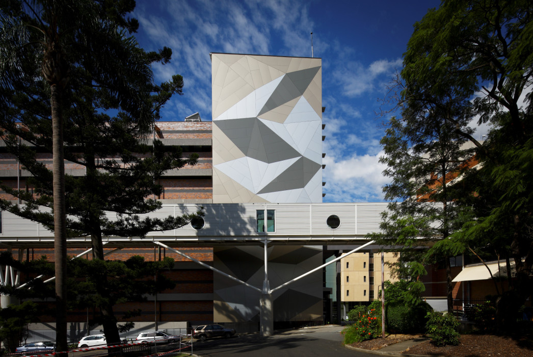 The new triangular façade statement provides an important sunshading system as well as an identity for the building. This, alongside the new double story entry, provides a focus towards the upper plaza connections and adjacent UQ facilities. The stainless steel, faceted screen changes reflectivity as the sun travels across the façade and creates a point of reference to the UQ precinct from various locations on the RBWH campus.